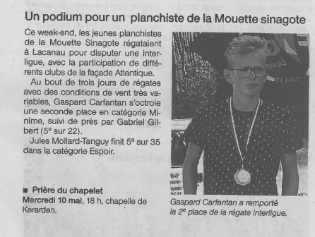 Au final, Gaspard CARFANTAN s’octroie une très belle seconde place en catégorie Minime , suivi de près par Gabriel GILBERT ( 5eme sur 22). Jules MOLLARD-TANGUY finit 5ème sur 35 dans la catégorie Espoir. Et en prime un bel article dans Ouest-France !