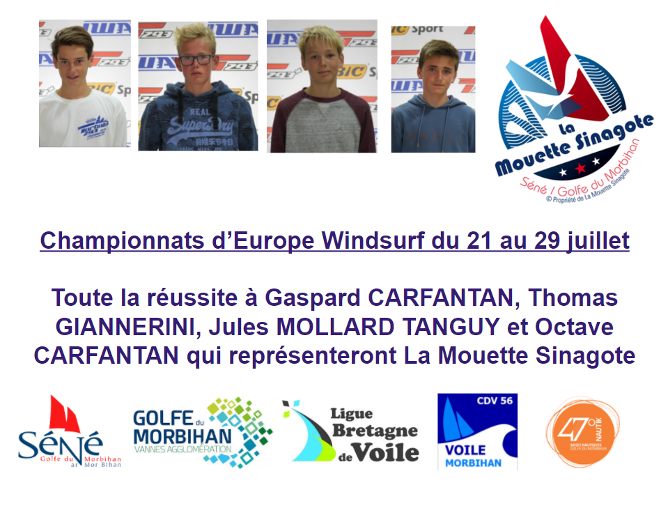 Quatre jeunes de La Mouette Sinagote, Jules MOLLARD TANGUY, Thomas GIANNERINI, Gaspard CARFANTAN et Octave CARGANTAN représenteront le club aux Championnats d’Europe de Windsurf à Lorient du 21 au 29 juillet. Après les très bons résultats aux Championnats de France nous leur souhaitons toute la réussite !