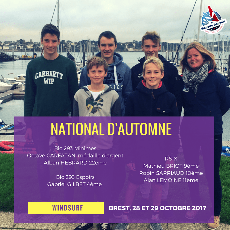 Le National d’Automne Windsurf à Brest a eu lieu ces 28 et 29 octobre 2017. Les résultats sont excellents pour les jeunes Mouettes coachés par Marion : Octave CARFANTAN rajoute une victoire au palmarès familial avec une superbe médaille d’argent en minimes Bic 293 et Gabriel GILBERT échoue au pieds du podium. Les RS-X se tiennent en pelon autour de la 10ème place. Les résultats complets :
